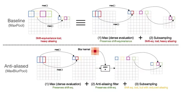 BlurPool/2 = Anti-aliasing Blur/1 + Subsampling/2。