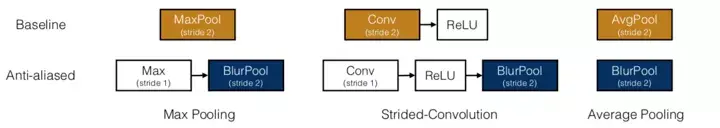 那么maxpooling、average pooling和strided convolution就可以分为修改为Anti-aliased的版本。