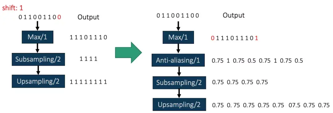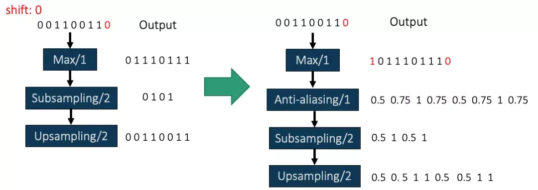 只平移1个像素,Maxpooling结果就发生了巨大差异。下采样是CNN平移不变性丢失的罪魁祸首。