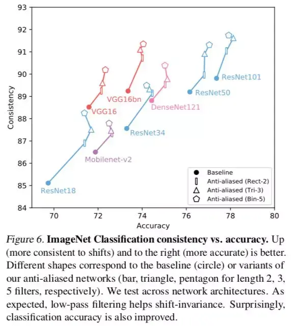 下图给出了ImageNet数据集上添加Anti-aliasing后的consistency与Accuracy。consistency是输入图片,给两种不同shift后,类别保持一致的比例。可以添加Anti-aliasing以后,无论是选择哪种anti-aliasing kernel,相较于baseline无论准确度和一致性均有明显上升,这个是意外的,作者认为应该会损失准确度,但反而增加了准确度。图中的kernel是指: