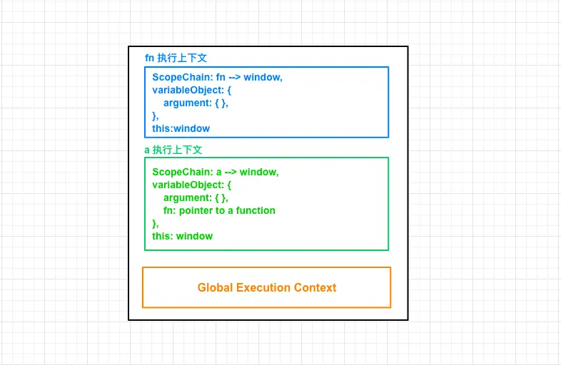 - 执行函数a,创建新的执行上下文并入执行栈,发现新的函数fn,继续;