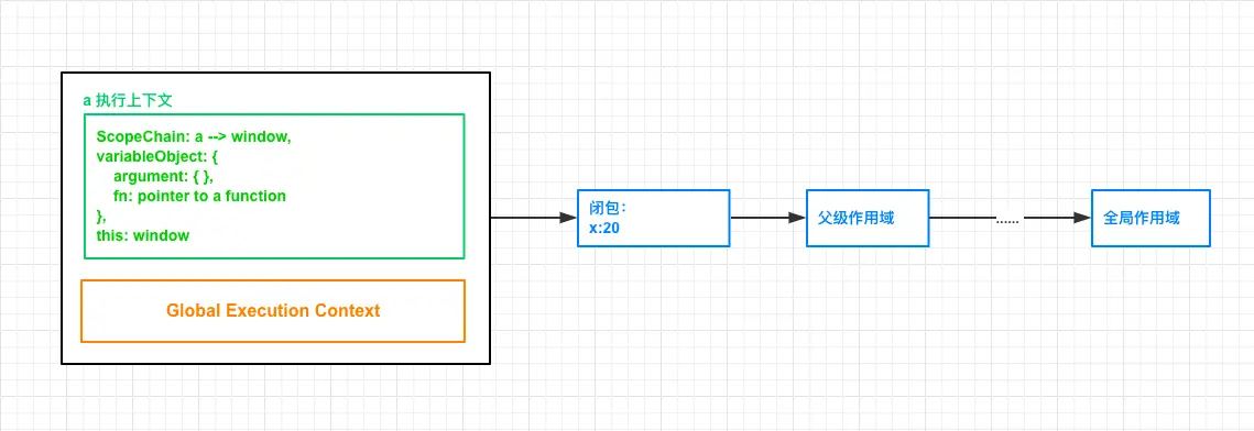 执行时: - 执行函数show,创建新的执行上下文并入执行栈,返回匿名函数的定义和它的闭包给变量a(注意:不仅返回函数定义,还返回了函数的闭包,而“背包”中装的恰恰就是函数声明时所在作用域中的所有变量:这里仅有x --> 20)。show执行上下文从执行栈中推出;