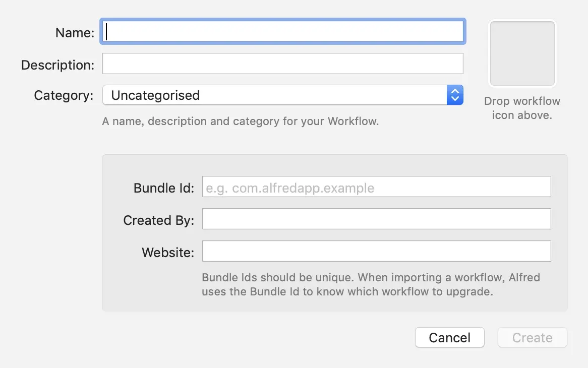 - 打开alfred的偏好设置=>选择workflow=>点击左下角的+=>选择blank workflow=>填入相关信息即创建一个新的workflow