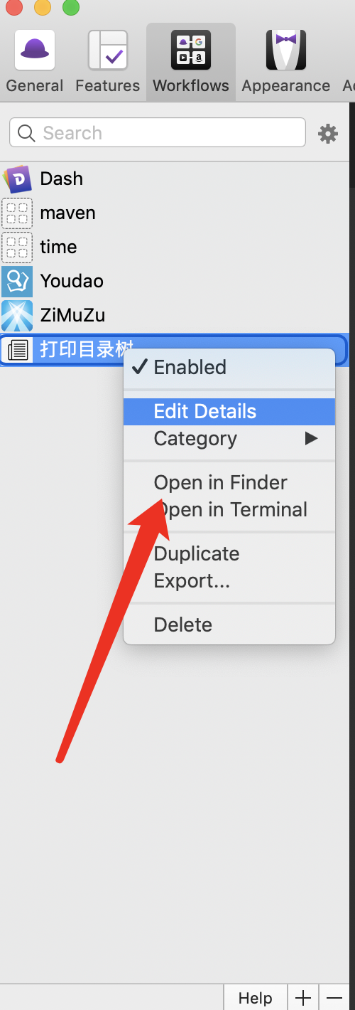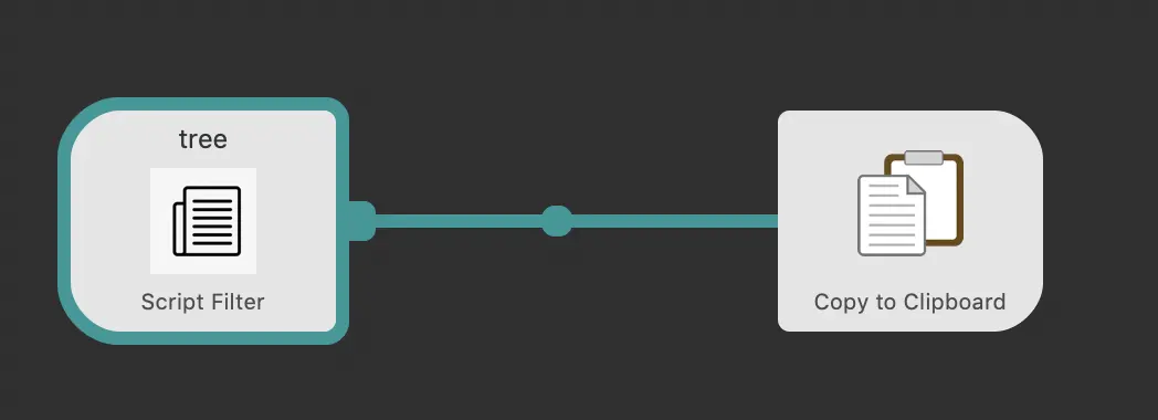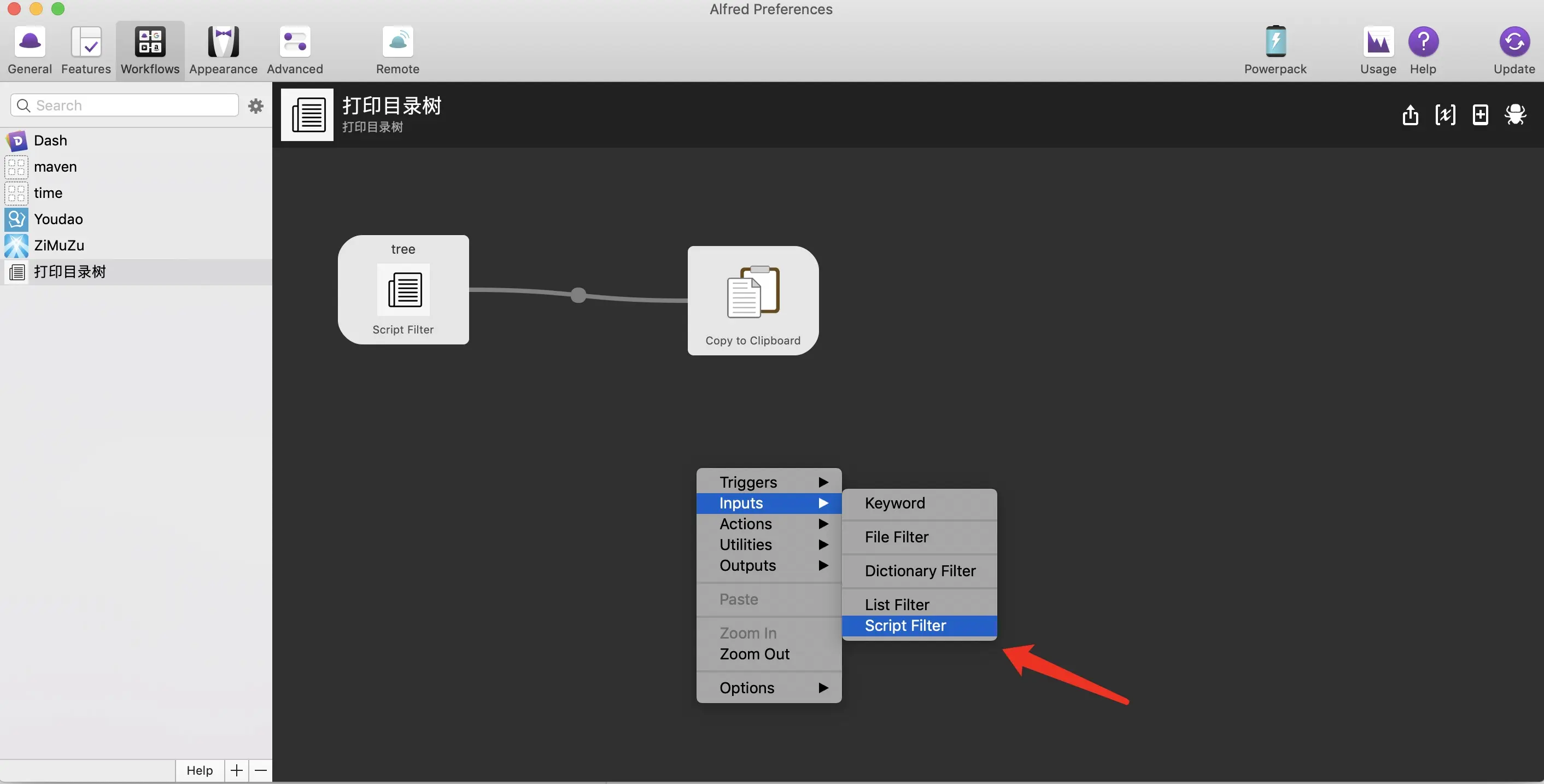 到此,就可以直接在命令行中输出一个树形结构的目录,下面介绍如何通过alfred的workflow将结果复制到粘贴板