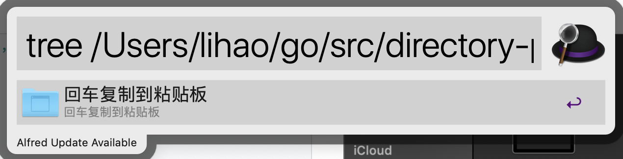 前几天写笔记的时候,想要一个目录树,很无奈手上没有任何工具,只能自己照着目录结构一个一个敲。今天就索性自己动手,用go结合alfred写一个打印目录树到粘贴板的workflow,这是演示图