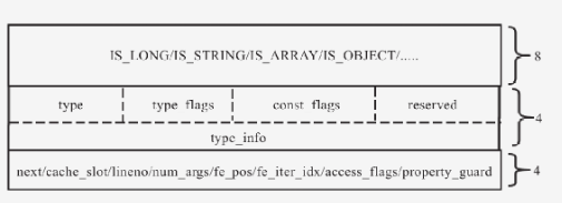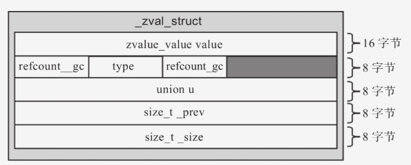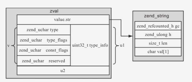 zval 的结构由一个保存变量类型的值或指针的 union 联合体 zend_value 以及两个 union 联合体 u1 和 u2 组成