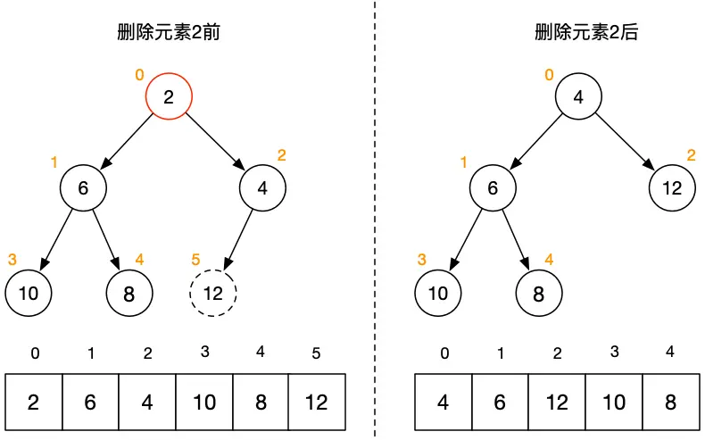 3. 堆化操作:先执行“下沉(siftDown)”操作,若该元素未“下沉”,则再执行“上浮(siftUp)”操作,使得数组删除元素后仍满足堆结构。