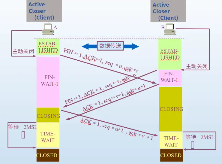 同时关闭和前面同时打开的四次握手过程基本类似,流程如下: