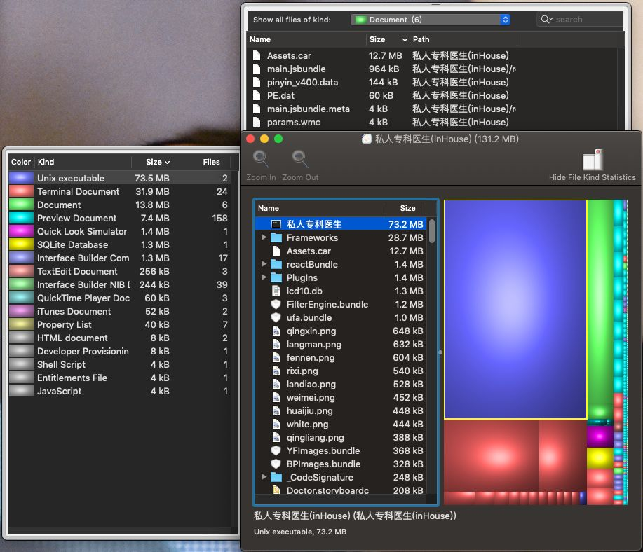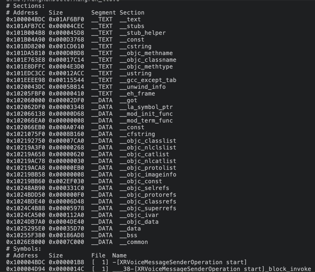 获取到分析结果后,我们可以精确了解各个模块、链接库、方法在可执行文件中的位置和占用空间: