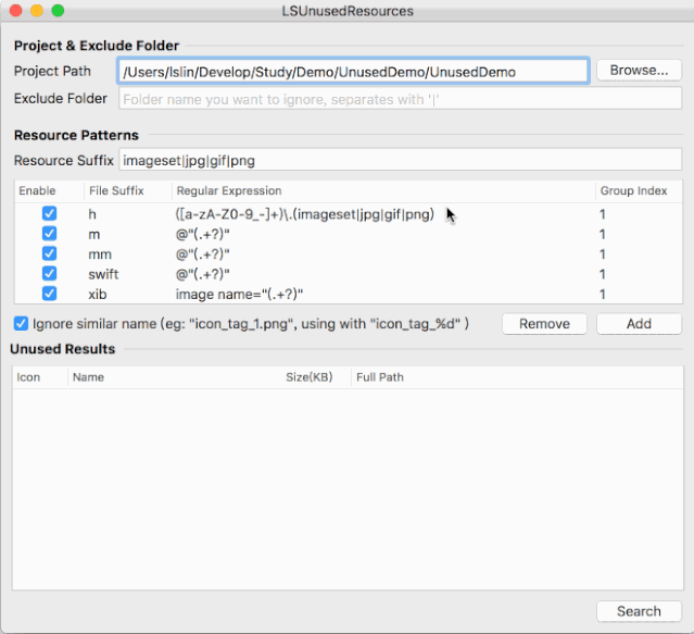 针对一些特殊情况,比如代码中使用例如 [UIImage imageNamed:[NSString stringWithFormat:@"icon_tag_%d", index]] 的方式引用资源,LSUnusedResources 也支持使用正则表达式来模糊匹配。