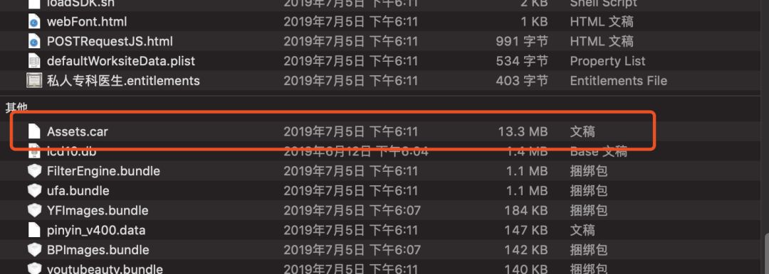 App 运行需要的各种资源文件也是 ipa 体积的大头,常见的有: