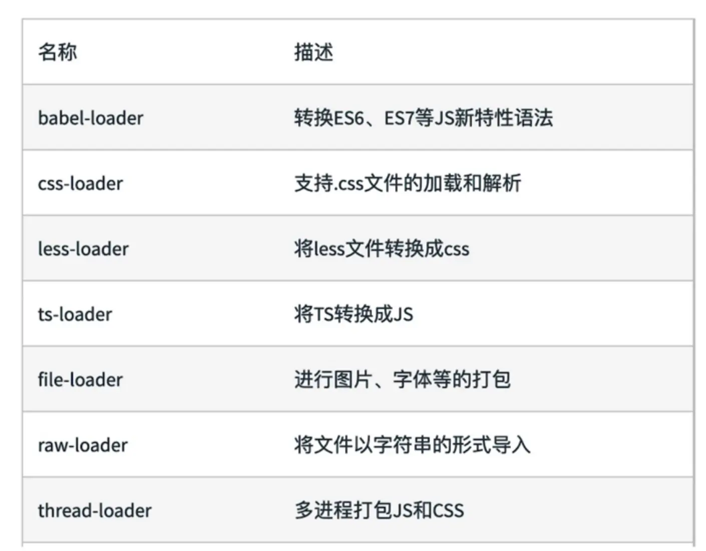 - webpack 可以使用 loaders 来预处理文件。这允许你打包除 JavaScript 之外的任何静态资源,他是一个函数。loaders有很多,常用的如下: