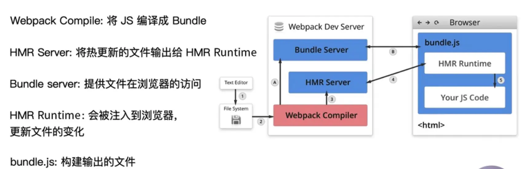 A->B是首次编译过程。1—>2—>3->4 是文件改动后热更新过程