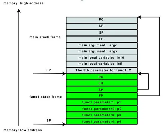 上图中蓝灰色部分是main函数的栈帧,绿色部分是func1的栈帧。左边的标有SP、FP的箭头分别指向func1的栈顶和main的栈顶。右边的两条折线代表函数func1返回的时候(栈收缩),SP和FP将要指向的地方。