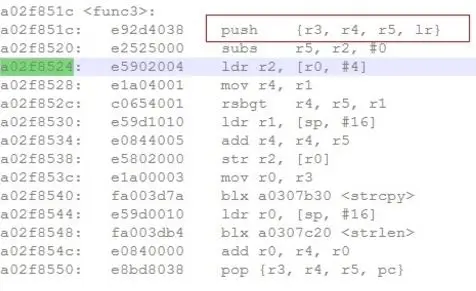 可以看到问题出现时的PC寄存器取值为0xa02f8524, SP寄存器的值为0xa84f26d8。通过反汇编代码可以看到,PC指针落在函数func3内部。另外看到func3中入栈了4个寄存器,每个寄存器4个字节,lr的值(也就是栈底)应该位于0xa84f26d8(当前的栈顶)向上偏移12个字节的地方,也就是0xa84f26e4的地方,从栈信息中可以看到这里的数值是0xa02f85d8,指向函数func1。