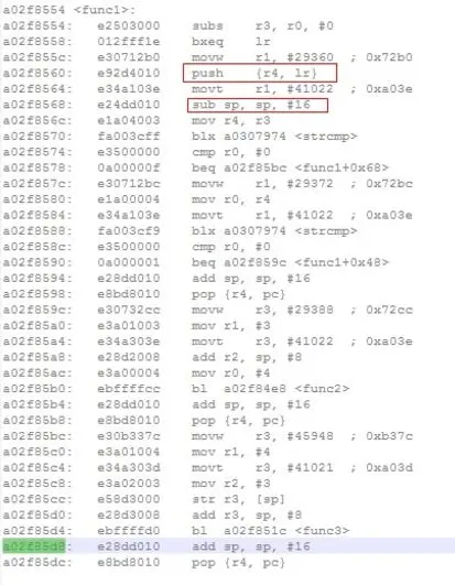 从下图func1的汇编代码中可以看到,栈增长了16个字节,并且有两个寄存器入栈。本栈帧中lr的位置应该在0xa84f26e4(func3栈帧中lr的位置)的基础上向上偏移24个字节,也就是0xa84f26fc,从栈信息中可以看到这里的数值是0xa02f8a70, 指向函数func2,同样的方法,可以得到再往上一级调用是0xa029d404, 指向func。这样我们就得到了下面的调用链: