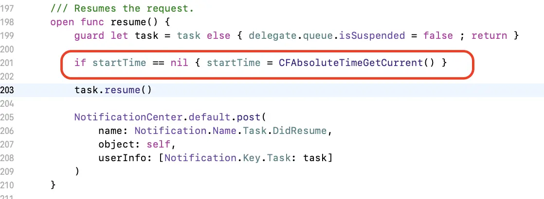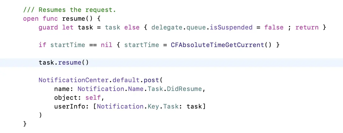 你会发现这里是request.resume(),然而正常情况下不应该是task.resume()吗🙅♀️,由此可知,在这里的request.resume()方法内部必然保存了task.resume()方法。跟进去看下: