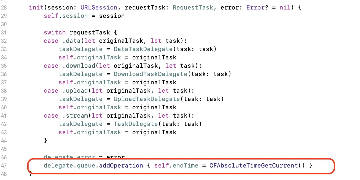 但是因为此时当前队列默认为挂起状态,所以不会执行里面的任务。在网络请求完成回调 didCompleteWithError 方法时会恢复 queue队列queue.isSuspended = false,然后紧接着完成endTime赋值。