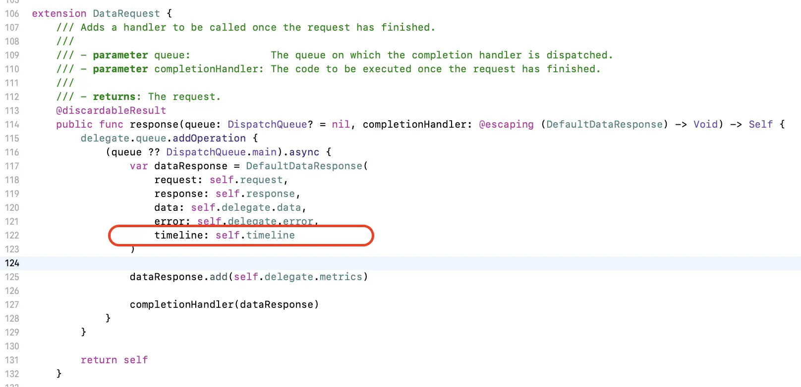 ResponseSerialization.swift的Response 方法中,会向 queue队列中添加一个任务,因为当前未使用自定义的序列化方法,所以直接返回请求回来的数据,而返回的数据中保存着self.timeline.