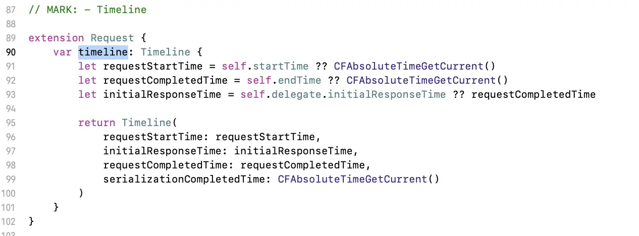 self.timeline 时,会初始化 Timeline 对象,对前面的时间做个记录,并将当前时间戳作为参数 serializationCompletedTime的值传递给 Timeline 对象。
