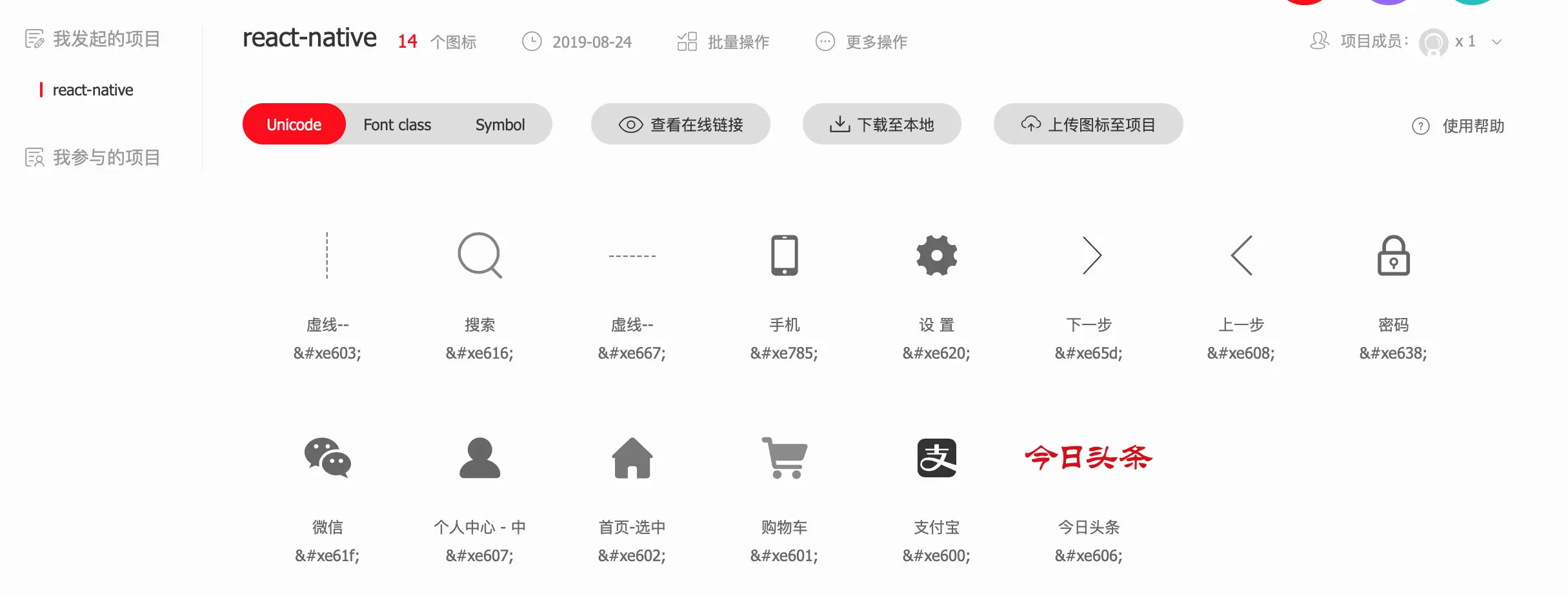 首先,在iconfont官网注册好账号,创建好相应的iconfont项目,并且把React-Native项目中所需要的图标添加到iconfont项目当中: