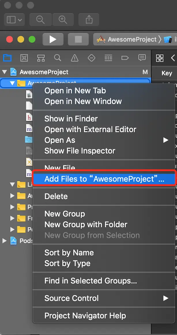 第四步,用xCode 打开iOS项目,然后右键选择 "Add Files to "***",选择上面复制到ios目录下的iconfont.ttf文件,直接点击确定。