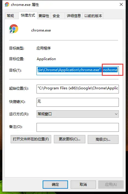 右键“Chrome”浏览器-->属性-->目标-->在最后面添加 “ -nohome”