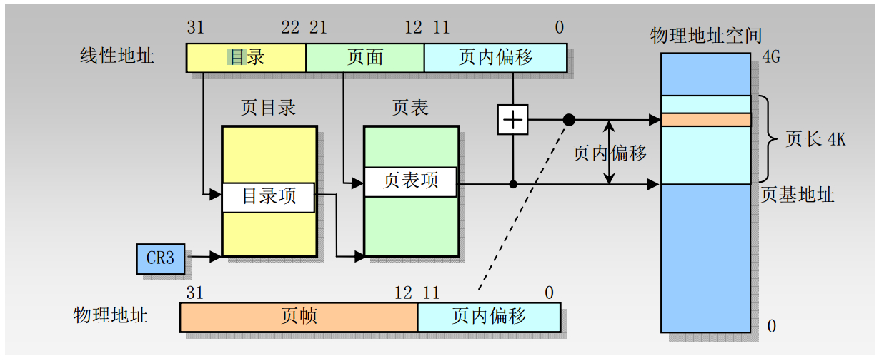 - 由线性地址中的页号,以及外层页表寄存器(CR3)中的外层页表始址,找到二级页表的始址
