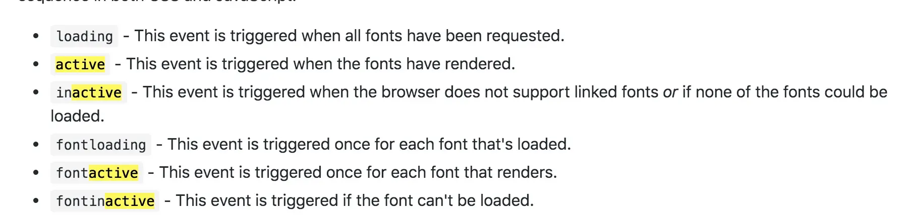 首先通过require引入webfontloader,并且动态插入一个script标签载入google的字体,然后调用webfontloader的load方法进行配置监听,当字体加载完成后就会触发active钩子,开始绘制对应字体的内容,webfontloader提供了一个完整的事件系统钩子给开发者调用: