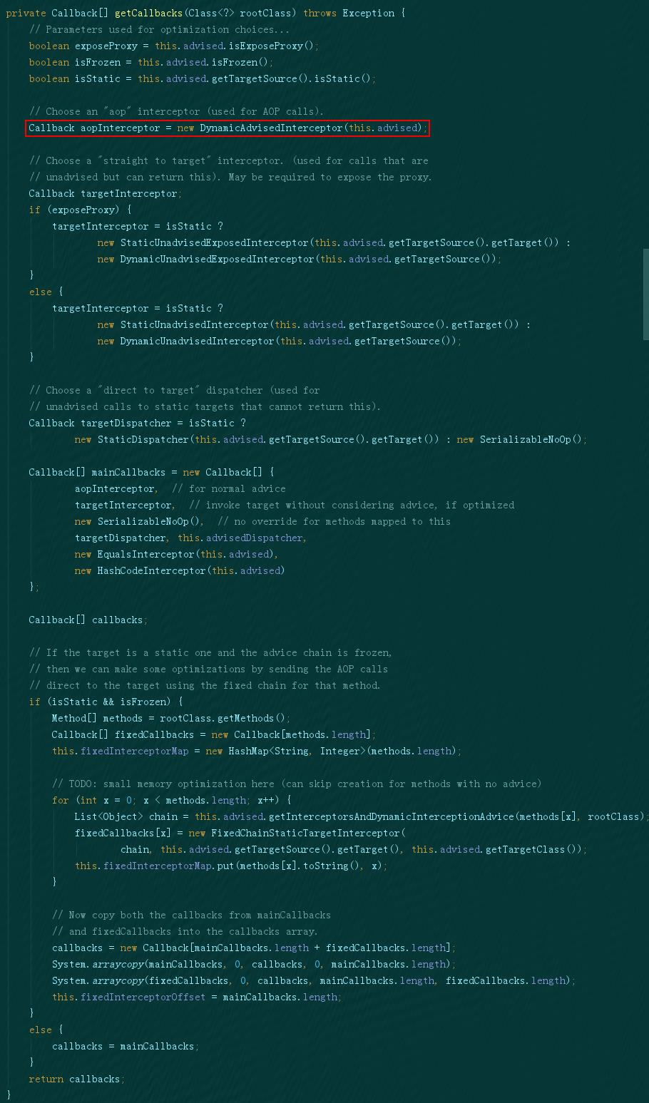这里将拦截器链封装到了DynamicAdvisedInterceptor中,并加入了Callback,DynamicAdvisedInterceptor实现了CGLIB的MethodInterceptor,所以其核心逻辑在intercept方法中: