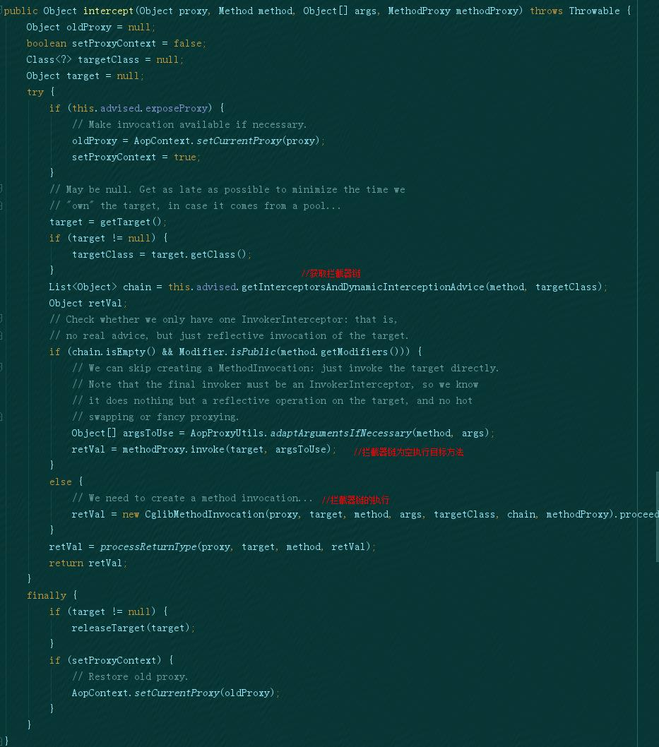 第51行~第56行的代码,如果拦截器列表不为空,按照注释的意思,需要一个ReflectiveMethodInvocation,并通过proceed方法对原方法进行拦截,proceed方法感兴趣的朋友可以去看一下,里面使用到了递归的思想对chain中的Object进行了层层的调用。
