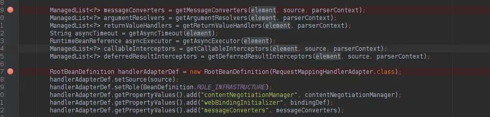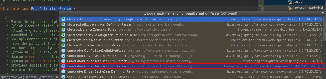 在AnnotationDrivenBeanDefinitionParser源码的152行parse方法中: