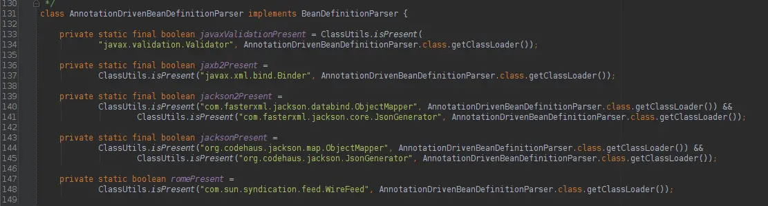 这些boolean属性是哪里来的呢,它们是AnnotationDrivenBeanDefinitionParser的静态变量。