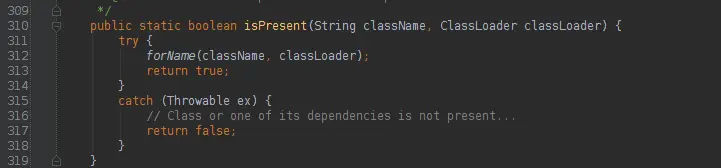 其中ClassUtils中的isPresent方法如下: