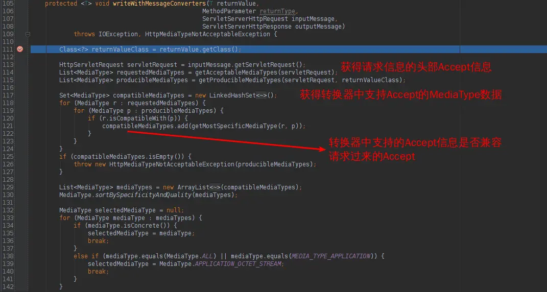 至于为何是请求头部的Accept数据,读者可以进去debug这个getAcceptableMediaTypes方法看看。 我就不罗嗦了~~~