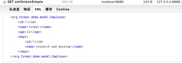@RequestMapping("/xmlOrJsonSimple")@ResponseBody public Employee xmlOrJsonSimple() { return employeeService.getById(1);}