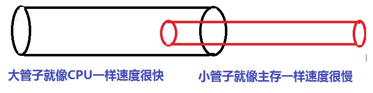 在计算机发展的第一个阶段,程序是在CPU中运行,数据在主存中保存。随着技术的发展,CPU的速度越来越多高,但是主存的速度却没有提高太多。就好比是下面这种情况: