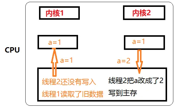 上面在介绍原子性问题的时候说了,两个线程(CPU内核)访问同一个变量时,线程2修改了这个变量的值,但是线程1却没有看到其修改,所以读的仍然是旧数据。