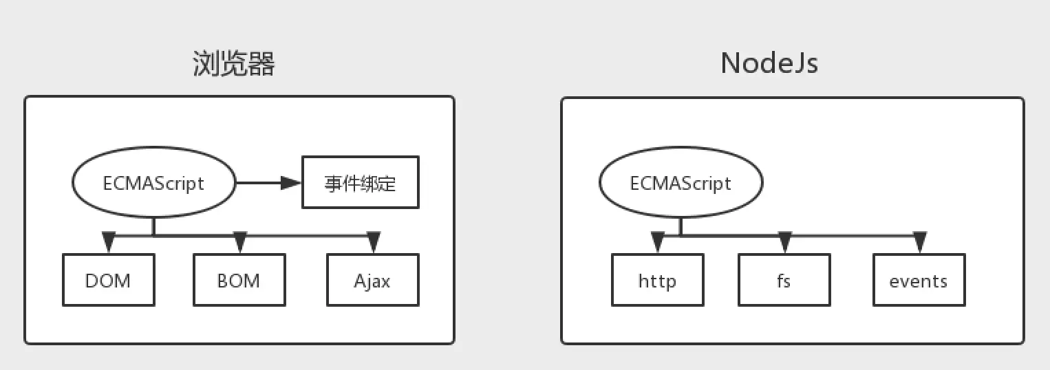 上图可以看到,语法都是相同的语法(ECMAScript),只不过所在的环境不同,提供的API不同,能干的事就不一样了。图没有列出所有的API,但可以看出,在NodeJS环境中提供的http(http服务相关)。就可以让NodeJs写出服务端程序了。