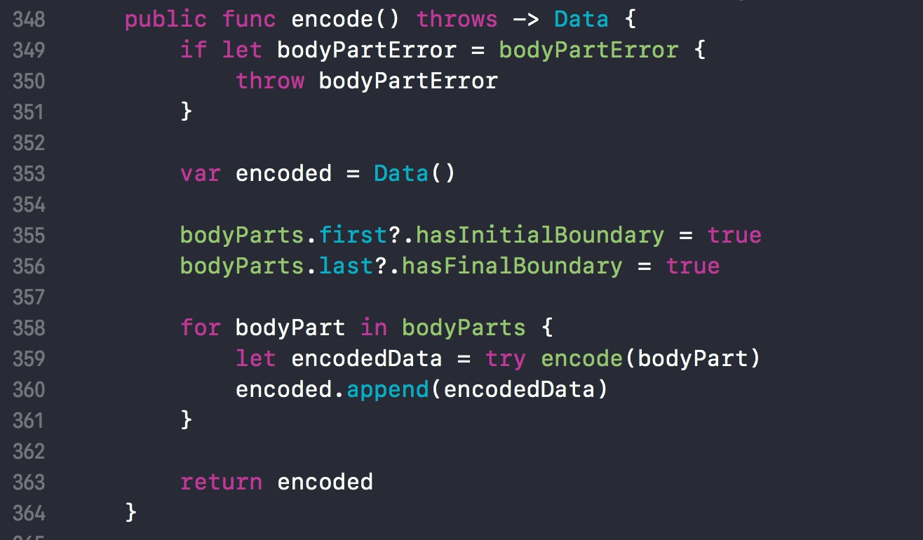 encode 函数会将 bodyParts 中的首尾两个元素分别设置 hasInitialBoundary = true 和 hasFinalBoundary = true,标识出其是首尾元素。