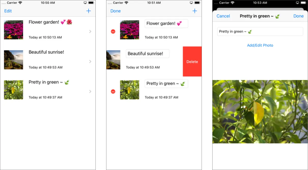 要删除,请使用FileManager的removeItem(at :)方法。 在构建和运行时,您会看到现在可以滑动行以永久删除它们。 请务必关闭并重新启动应用以验证它们是否已经消失。