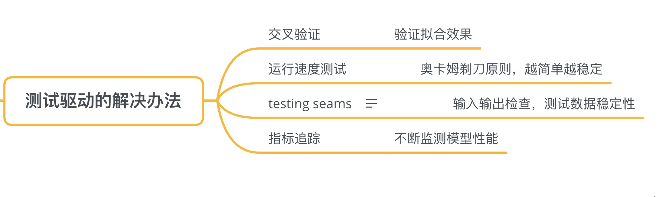 测试驱动有一个明显的好处就是,能够加快产品发布速度。以往的项目,需求讨论会占据很大时间,讨论完之后,开发方案一旦定下来,后续变更就很难。而现实却是需求常常变更,这往往会导致产品发布的延期。而在机器学习上,测试驱动好处更多体现在保证模型质量上。具体来讲,常通过以下办法: