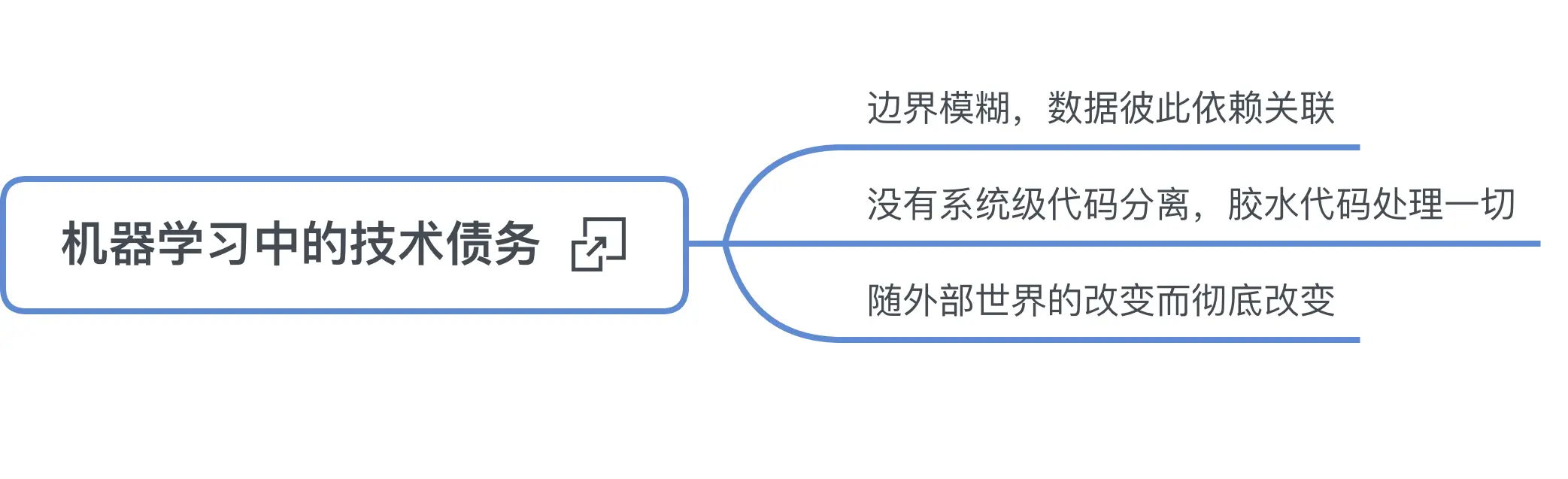 机器学习项目中同样存在债务危机,Google 还就此写了篇文章 《Machine Learning: The High interest Credit Card of Technical Debt》。总结起来有三种:一、边界模糊,数据之间彼此依赖关联。二、没有系统级别代码分离,胶水代码处理一切。三、机器学习系统随着外部世界的改变而彻底改变。