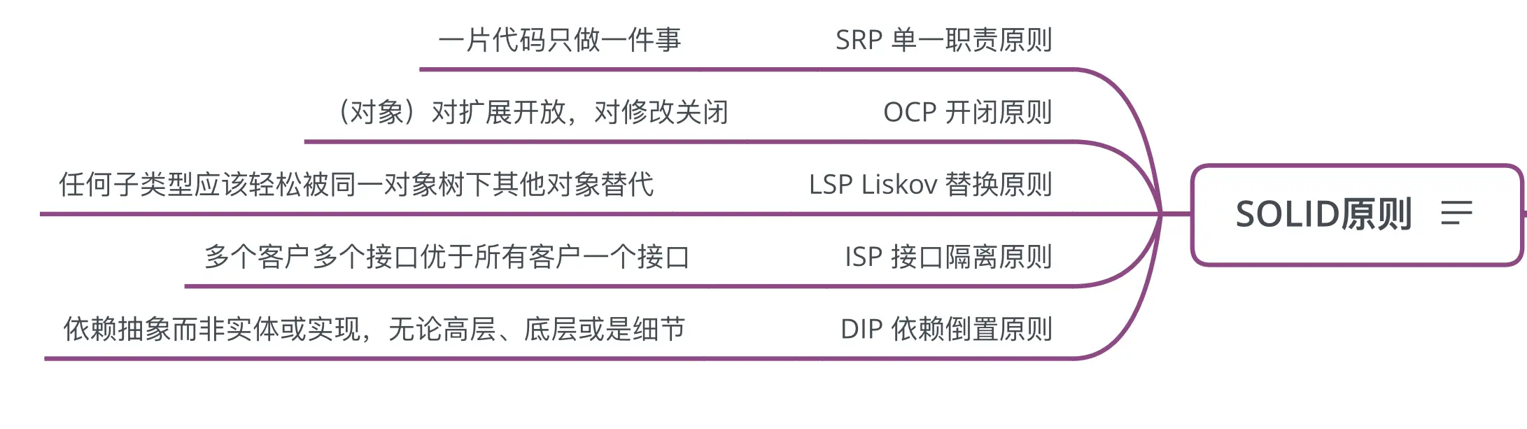 SRP 单一职责原则:一片代码只做一件事,及一块代码只实现某一特定功能,尽量减少逻辑的交叉堆叠。