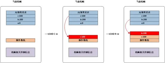 例如 a = b + c 的字节码执行过程中操作数栈以及局部变量表的变化如下图所示。