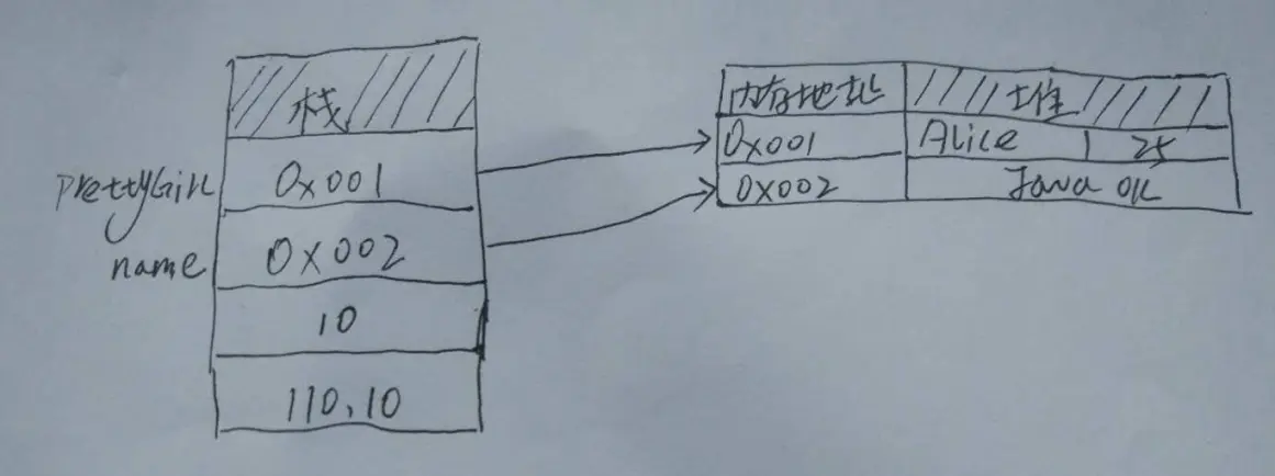 通过类名 对象名 = new 类名()创建对象, 在 PrettyGirl prettyGirl = new PrettyGirl();这行代码在内存中就创建了两块内存空间,第一块在栈中,名字叫 prettyGirl,它是一个引用地址,并不放具体的数值,第二块堆中的内存才存放具体的数值,如name,age等信息。
