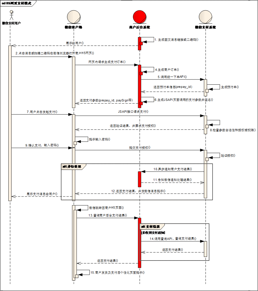 - 用户在微信公众账号内进入商家公众号,打开某个主页面,完成支付