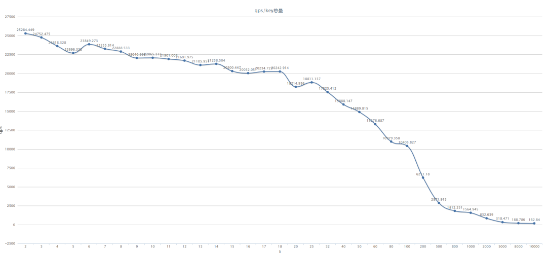 笔者需求任务算是完成了,可是再进一步思考,redis的pipeline一次性带上多少HGETALL操作的key才是合理的呢?换句话说,服务器吞吐量大了,可能就会导致qps急剧下降(网卡大量收发数据和redis内部协议解析,redis命令排队堆积,从而导致的缓慢),而想要qps高,服务器吞吐量可能就要降下来,无法很好的利用带宽。 对两者之间的取舍,同样是不能拍脑袋决定的,用压测数据说话! 简单写了一个压测程序,通过比较请求量和qps的关系,来看一下吞吐量和qps的变化,从而选择一个适合业务需求的值。package mainimport ( "crypto/rand" "fmt" "math/big" "strconv" "time" "github.com/garyburd/redigo/redis")const redisKey = "redis_test_key:%s"func main() { for i := 1; i < 10000; i++ { testRedisHGETALL(getPreKeyAndLoopTime(i)) }}func testRedisHGETALL(keyList [][]string) { Conn, err := redis.Dial("tcp", "127.0.0.1:6379") if err != nil { fmt.Println(err) return } costTime := int64(0) start := time.Now().Unix() for _, keys := range keyList { for _, key := range keys { Conn.Send("HGETALL", fmt.Sprintf(redisKey, key)) } Conn.Flush() } end := time.Now().Unix() costTime = end - start fmt.Printf("cost_time=[%+v]ms,qps=[%+v],keyLen=[%+v],totalBytes=[%+v]", 1000*int64(len(keyList))/costTime, costTime/int64(len(keyList)), len(keyList), len(keyList)*len(keyList[0])*len(redisKey))}//根据key的长度,设置不同的循环次数,平均计算,取除网络延迟带来的影响func getPreKeyAndLoopTime(keyLen int) [][]string { loopTime := 1000 if keyLen < 10 { loopTime *= 100 } else if keyLen < 100 { loopTime *= 50 } else if keyLen < 500 { loopTime *= 10 } else if keyLen < 1000 { loopTime *= 5 } return generateKeys(keyLen, loopTime)}func generateKeys(keyLen, looTime int) [][]string { keyList := make([][]string, 0) for i := 0; i < looTime; i++ { keys := make([]string, 0) for i := 0; i < keyLen; i++ { result, _ := rand.Int(rand.Reader, big.NewInt(100)) keys = append(keys, strconv.FormatInt(result.Int64(), 10)) } keyList = append(keyList, keys) } return keyList}
