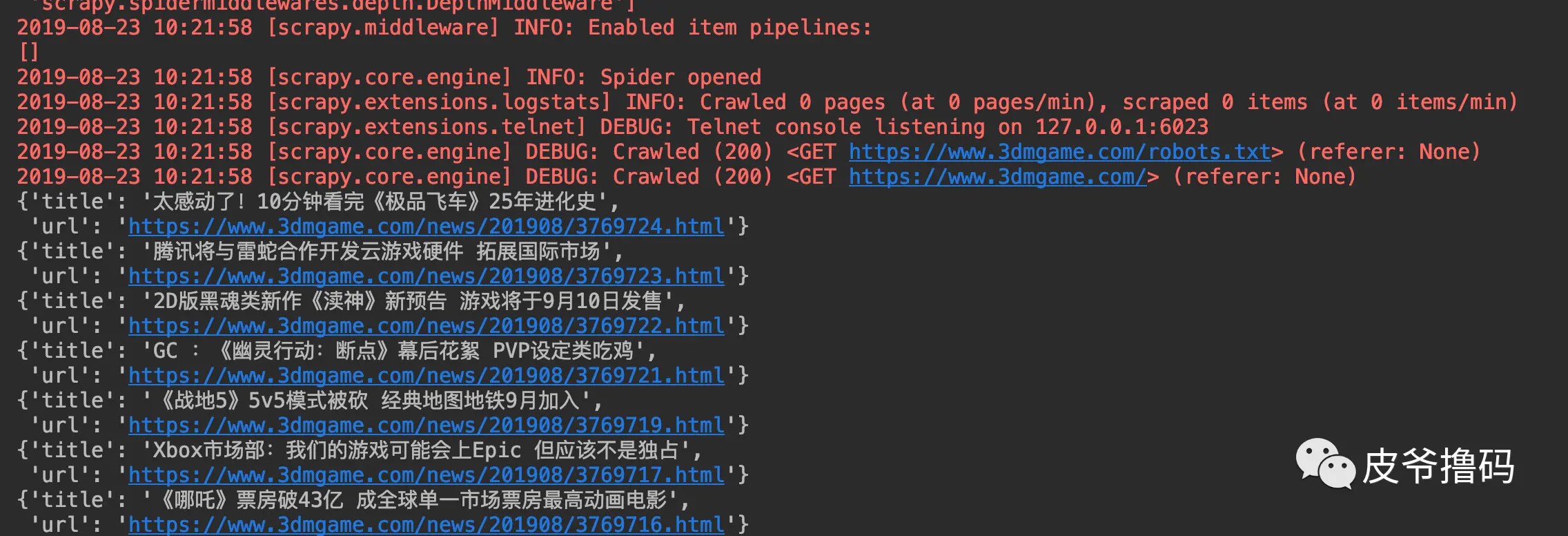 # Spider.pyclass SamplespiderSpider(scrapy.Spider): name = 'SampleSpider' allowed_domains = ['www.3dmgame.com'] def start_requests(self): start_url = "https://www.3dmgame.com/" yield Request(url=start_url, callback=self.parse_block_page, dont_filter=True) def parse_block_page(self, response): news_list = response.xpath("//div[@class='Listwrap']//a").extract() for content_item in news_list: selector = Selector(text=content_item) spider_item = DockerpyspiderItem() spider_item['title'] = selector.xpath("//text()").extract_first() spider_item['url'] = selector.xpath("//@href").extract_first() print(spider_item)# Items.pyclass DockerpyspiderItem(scrapy.Item): title = scrapy.Field() url = scrapy.Field()