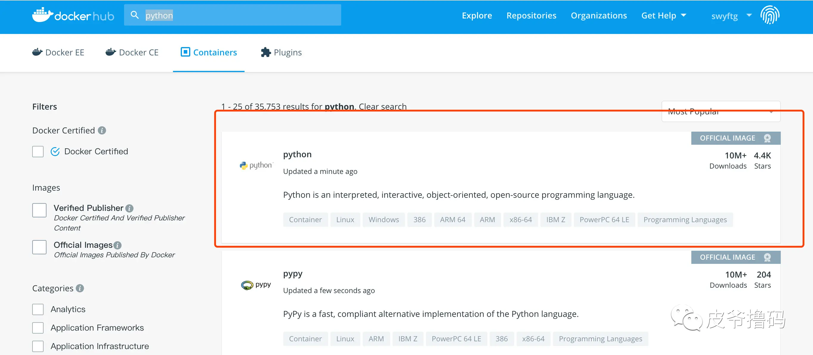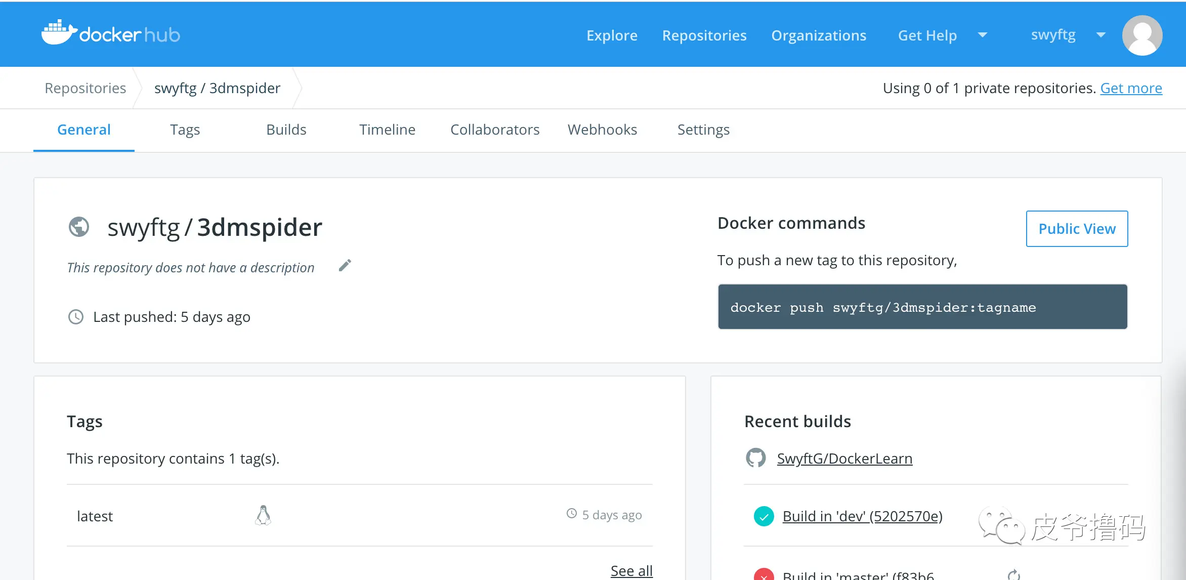 既然我们已经把代码放到了 DockerHub 上,我们就来看看我们的 Image 是否能够找得到吧: